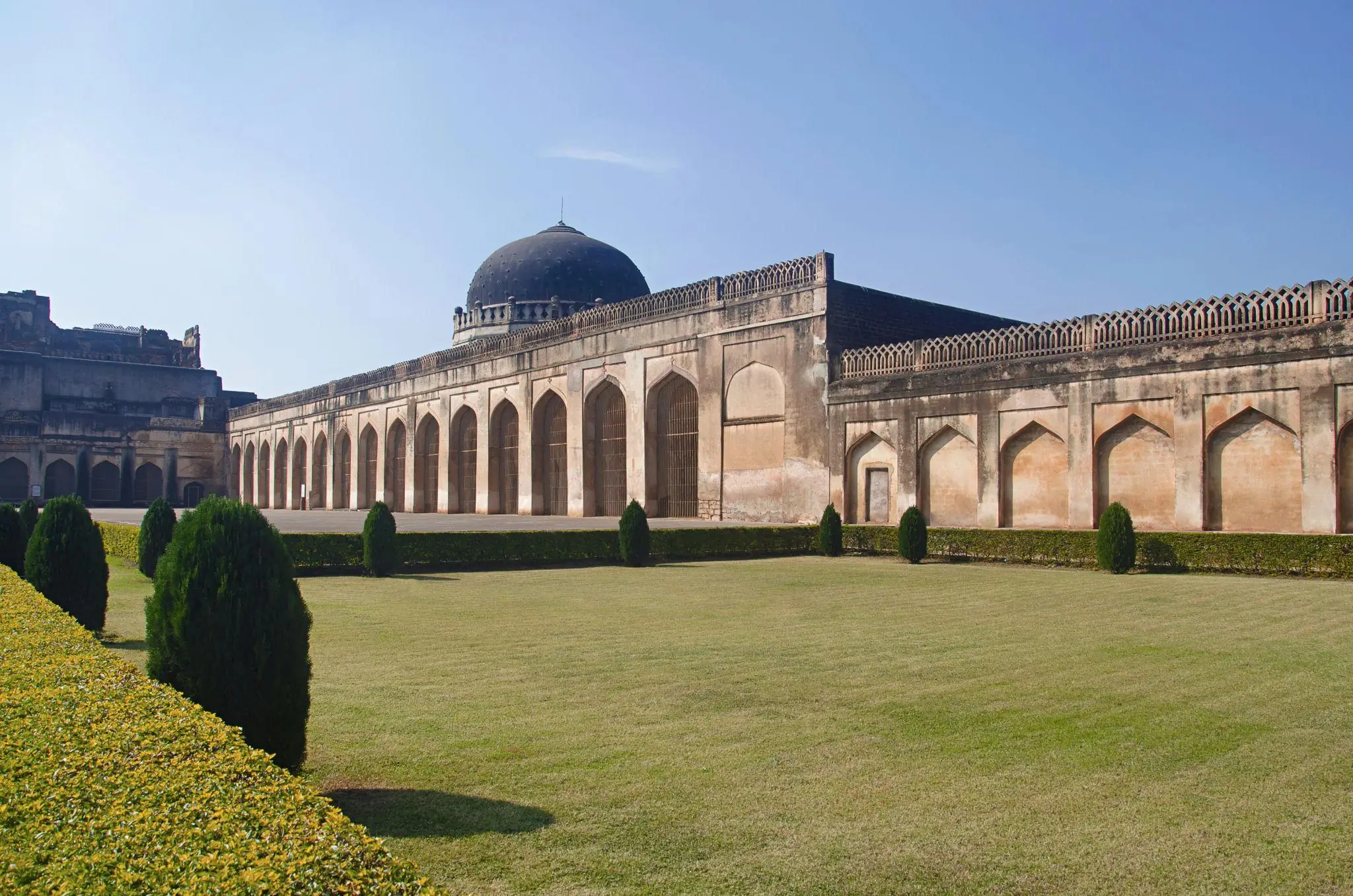 The name comes from the sixteen pillars that support the front hall. It was built in the mid-15th century during the rule of the Bahmani Sultanate and served as the main mosque for the royal families and soldiers living inside the fort. The mosque has a big prayer hall and a courtyard. Even though the interiors have faded over time, the structure still feels powerful and steady.